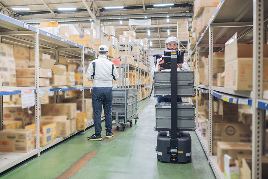 The pick assist robot Rapyuta PA-AMR developed by Rapyuta Robotics performs picking in collaboration with warehouse associates. AI suggests the shortest picking routes and also handles the transportation of items.