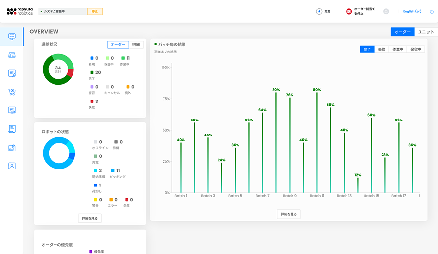 Rapyuta PA-AMR consists of our original software, group control AI, and made-in-Japan hardware, making it agile and responsive to your needs. Optimization and efficiency improvement by group control not only saves manpower and labor, but also reduces the burden of hiring and training new staff. Even during busy periods, only a small number of additional staff need to be hired, making staffing easier.